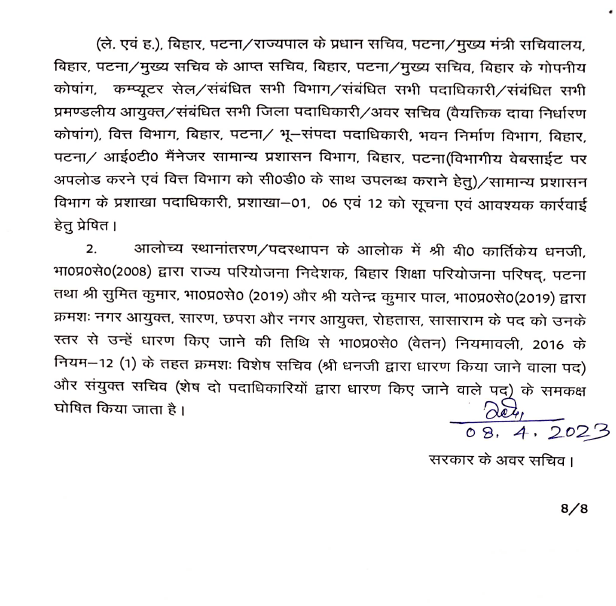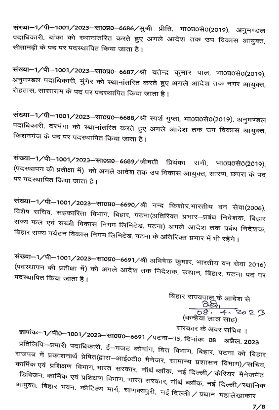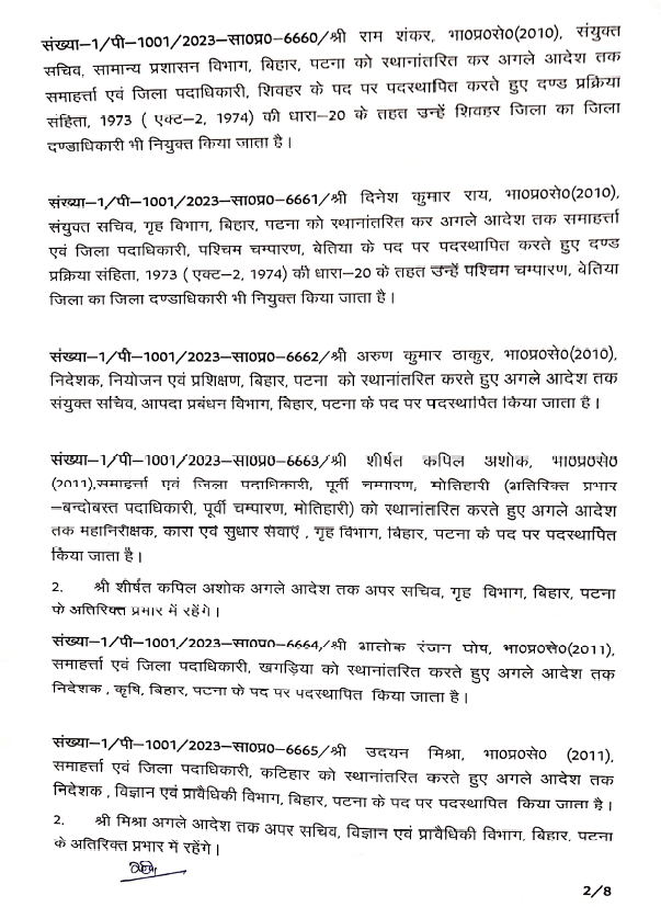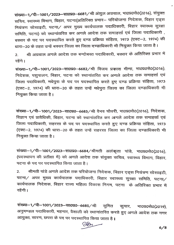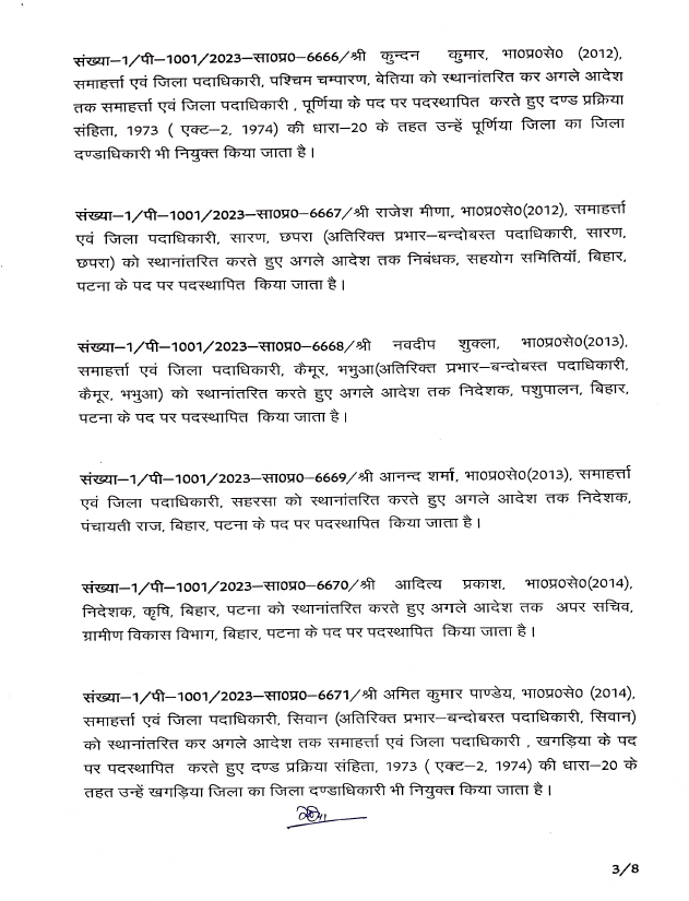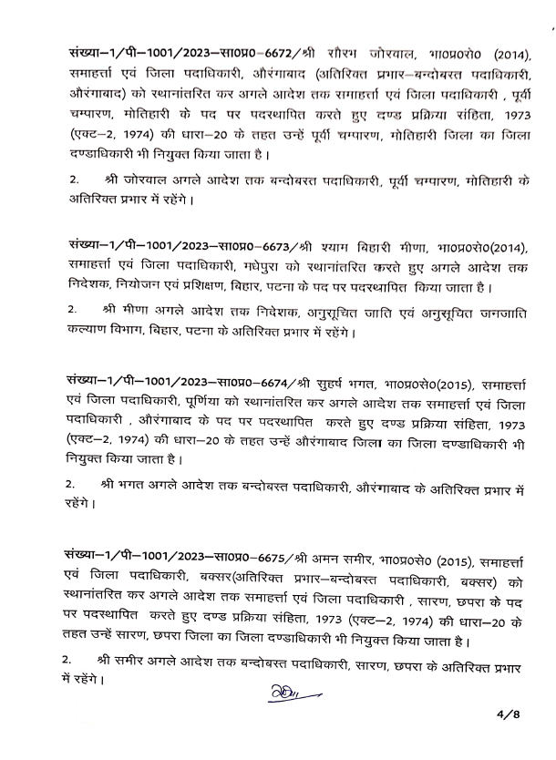 बिहार: बिहार से बड़ी खबर सामने आ रही है। बिहार में बड़े पैमाने पर आईएएस( IAS) अधिकारियों का तबादला किया गया है. वहीं कई जिलों के डीएम(डिस्ट्रिक्ट मजिस्ट्रेट) बदले गए हैं. सरकार ने पूर्वी चंपारण, पश्चिम चंपारण, शिवहर,बक्सर, कटिहार, पूर्णिया, सहरसा, खगड़िया, औरंगाबाद, मधेपुरा, छपरा, कैमूर, शेखपुरा, सीवान के जिलाधिकारियों का तबादला कर दिया है. इस मामले में आईएएस के तबदले को लेकर विभाग की ओर से अधिसूचना जारी कर दी है . वहीं लघु जल संसाधन विभाग के सचिव विनोद सिंह गुंजियाल को मद्ध निषेध विभाग का सचिव बनाया गया है. ये निबंधन महा निरीक्षक और उत्पाद आयुक्त के अतिरिक्त प्रभार में रहेंगे . बी. कार्तिकेय धनजी को राज्य परियोजना निदेशक बिहार शिक्षा परियोजना के पद पर भेजा गया है. इसके साथ ही राज्य परिवहन आयुक्त के अतिरिक्त प्रभार में भी रहेंगे . वहीं सीमा त्रिपाठी को परिवहन आयुक्त से ट्रांसफर करते हुए विशेष सचिव कला संस्कृति एवं युवा विभाग के पद पर पदस्थापित किया गया है. इनके साथ ही कुल मिलाकर 36 आईएएस अधिकारियों का तबादला किया है.