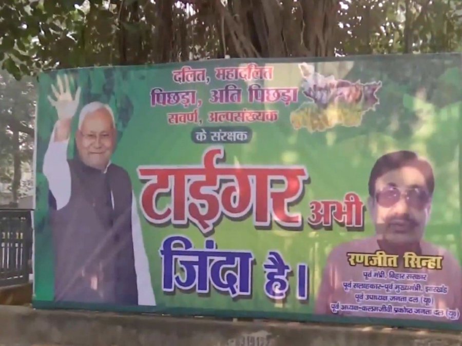 पटना में जेडीयू की तरफ से आज एक पोस्टर लगाया गया है जिसमें कहा गया है कि टाइगर अभी जिंदा है. ये पोस्टर जेडीयू कार्यालय के बाहर लगा है. इसे पूर्वमंत्री रंजीत सिन्हा ने अपने नाम से छपवाया है. रणजीत सिंह ने नीतीश कुमार के लिए लिखा है ‘टाइगर ज़िंदा है’. सिन्हा ने इस टाइगर को समाज के सभी वर्गों का रक्षक बताया गया है. पोस्टर से ये संदेश देने की कोशिश की गई है कि नीतीश कुमार ही वो शख्स हैं जिन्हें फिर से यानी चौथी बार सीएम बनना चाहिये.