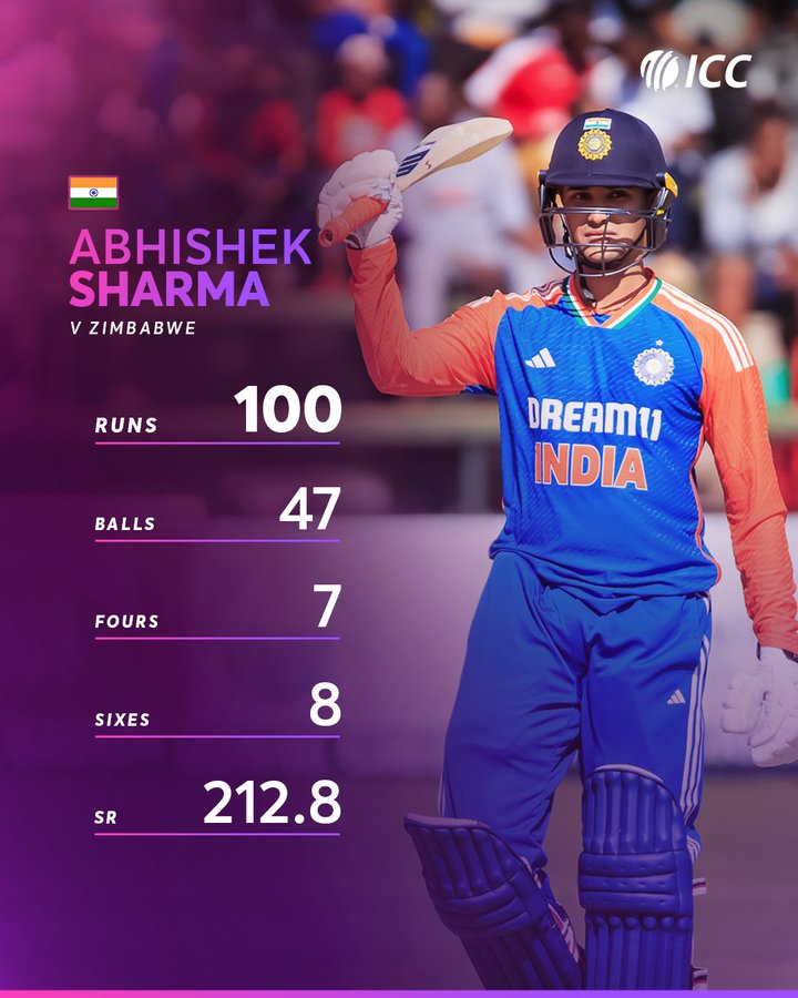 Ind vs Zim T20 Abhishek sharma : ज़िम्बाब्वे और भारत के बीच चल रहे टी T20 टूर्नामेंट में कमाल हो रहा है. टूर्नामेंट के पहले मैच में जहां ज़िम्बाब्वे ने वर्ल्ड चैपिंयन इंडिया टीम को 13 रनों से हरा दिया , वहीं दूसरे मैच में भारतीय टीम में डेब्यू कर रहे अभिषेक शर्मा ने मात्र 46 गेंदों में शतक ठोक कर T20 टूर्नामेंट में रिकार्ड बना दिया . अभिषेक शर्मा T20 फॉरमेट में फास्टेस्ट हंड्रेड(100) बनाने वाले पहले भारतीय बन गये हैं. अभिषेक शर्मा ने ये कारनामा आज हरारे में भारत -जिम्बाबे के बीच चल रहे T20 टूर्नामेट के दूसरे मैच में कर दिखाया है.