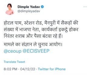 डिंपल यादव का कहना है कि होटल पाम, स्टेशन रोड, मैनपुरी में सैकड़ों की संख्या में भाजपा नेता, कार्यकर्ता इकट्ठे होकर निरंतर शराब और पैसा बंटवा रहे हैं.  कार्रवाई करने के बजाय प्रशासन आंखें मूंद कर बैठा हुआ है. मामले का संज्ञान ले चुनाव आयोग