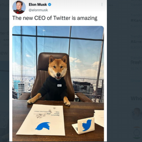 बुधवार की रात ट्वीटर पर एक हैशटैग तेजी से वायरल हुआ. #TwitterCEO. इस हशटैग पर सोशल मीडिया कंपनी के मालिक एलॉन मस्क ने खुद ट्वीट कर जानकारी दी की अब ट्वीटर का मालिक ये कुत्ता होगा. मस्क ने ट्टीट के साथ एक तस्वीर भी साझा की है.
