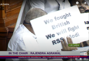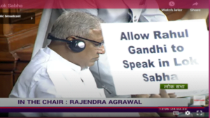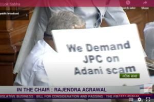 कई मौके पर प्लेकार्ड जिनपर अग्रेज़ी में लिखा था. “हम अग्रेज़ों से लड़े हम आरएसएस मोदी से भी लड़ेंगे”, “हम अडानी मामले में जेपीसी की मांग करते है” और “राहुल गांधी को लोकसभा में बोलने दिया जाए” नज़र भी आए. इसके साथ ही सदन में मोदी अडानी भाई-भाई, हमें जेपीसी चाहिए जैसे नारे भा साफ सुनाई दिए जा रहे थे.