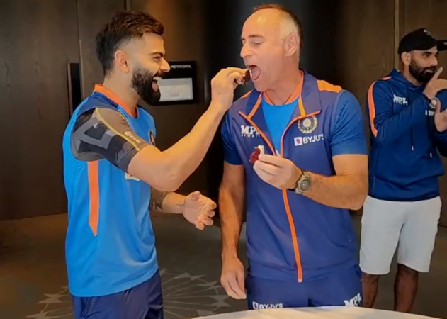 बीबीसीआई ने अपने ट्वीटर हैंडिल से वीडियो जारी किया है जिसमें विराट कोहली और पैडी आप्टन एक दूसरे को केक खिलाते नजर आ रहे हैं.
