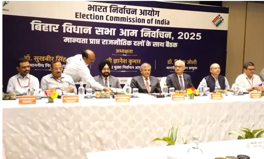 Patna EC Meeting : बिहार में होने वाले आगामी विधानसभा चुनाव के लिए तारीखों के ऐलान से पहले चुनाव आयोग ने आज मान्यता प्राप्त राजनीतिक दलों के साथ बैठक की.इस बैठक में मुख्य चुनाव आयुक्त ज्ञानेश कुमार के साथ अन्य दोनों चुनाव आयुक्त विवेक जोशी और सुखवीर सिंह संधू शामिल रहे.चुनाव आयोग की बैठकों का दौर कल यानी रविवार 5 अक्टूबर को भी जारी रहेगा.