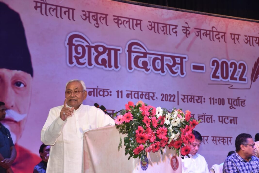 सीएम नीतीश राजधानी पटना में देश के प्रथम शिक्षा मंत्री मौलाना अबुल कलाम आजाद के जन्मदिन के अवसर पर मनाई जाने वाली शिक्षा दिवस कार्यक्रम में शामिल होने कृष्ण मेमोरियल हॉल पहुंचे. इस दौरान उनके साथ शिक्षा मंत्री चंद्रशेखर सिंह, वित्त मंत्री विजय कुमार चौधरी मौजूद थे.
