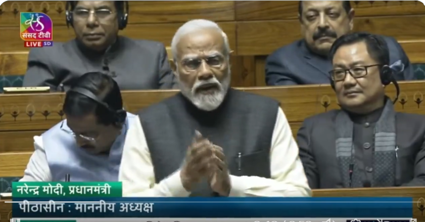 नई दिल्ली : प्रधानमंत्री मोदी PM Modi आज संसद में राष्ट्रपति द्रौपदी मूर्मु के अभिभाषण पर धन्यवाद प्रस्ताव देने के लिए पहुंचे. पीएम मोदी संसद में 100 मिनट से ज्यादा बोले . इस दौरान पीएम मोदी पूरे फॉर्म में नजर आये. पीएम मोदी ने अपने भाषण के दौरान गिन गिन कर विपक्ष पर निशाने साधे.