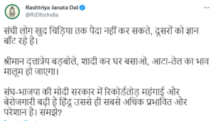 “संघी लोग खुद चिड़िया तक पैदा नहीं कर सकते, दूसरों को ज्ञान बाँट रहे हैं। श्रीमान दत्तात्रेय बड़बोले, शादी कर घर बसाओ, आटा-तेल का भाव मालूम हो जाएगा। संघ-भाजपा की मोदी सरकार में रिकॉर्डतोड़ महंगाई और बेरोजगारी बढ़ी है हिंदू उससे ही सबसे अधिक प्रभावित और परेशान है। समझे?”