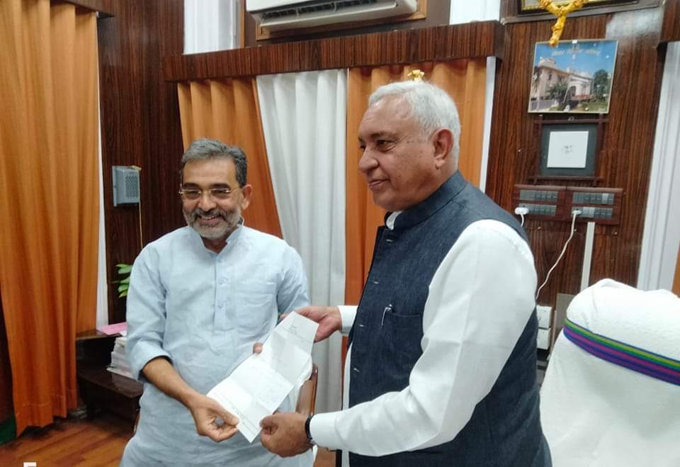 पटना : पिछले कुछ महीनों से लगातार नीतीश कुमार के खिलाफ मोर्चा खोलकर घूम रहे उपेंद्र कुशवाहा ने नीतीश सरकार में विधानपरिषद से भी इस्तीफा दे दिया है. कुशवाहा ने आज अपना इस्तीफा विधान परिषद के सभापति देवेश चंद्र ठाकुर को सौंप दिया. इस्तीफा देने के बाद कुशवाहा ने कहा कि – ‘मुख्यमंत्री जी आज मैंने विधान परिषद् की सदस्यता से इस्तीफा दे दिया है. मन अब हल्का है.चक्रव्यूह से बाहर आ जाने की सुखद अनुभूति हो रही है. याचना का परित्याग कर रण के रास्ते पर निकल पड़ा हूं’