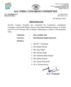 आजादी के बाद मध्य भारत के किसी शहर में पहली बार हो रहे कांग्रेस के महाधिवेशन में इतिहास बनने जा रहा है. रायपुर महाधिवेशन में कांग्रेस पार्टी का संविधान बदलेगा. राष्ट्रीय अध्यक्ष मल्लिकार्जुन खड़गे ने अंबिका सोनी की अध्यक्षता में एक आठ सदस्यीय समिति बनाकर से यह जिम्मेदारी सौंपी है. रणदीप सिंह सुरजेवाला इस समिति के संयोजक बनाए गए हैं. इसमें केसी वेणुगोपाल, मुकुल वासनिक, अजय माकन, जीतेंद्र सिंह, अभिषेक मनु सिंघवी, मोहन प्रकाश, दीपा दासमुंशी और डॉ. जी परमेश्वरा को सदस्य के तौर पर शामिल किया गया है.