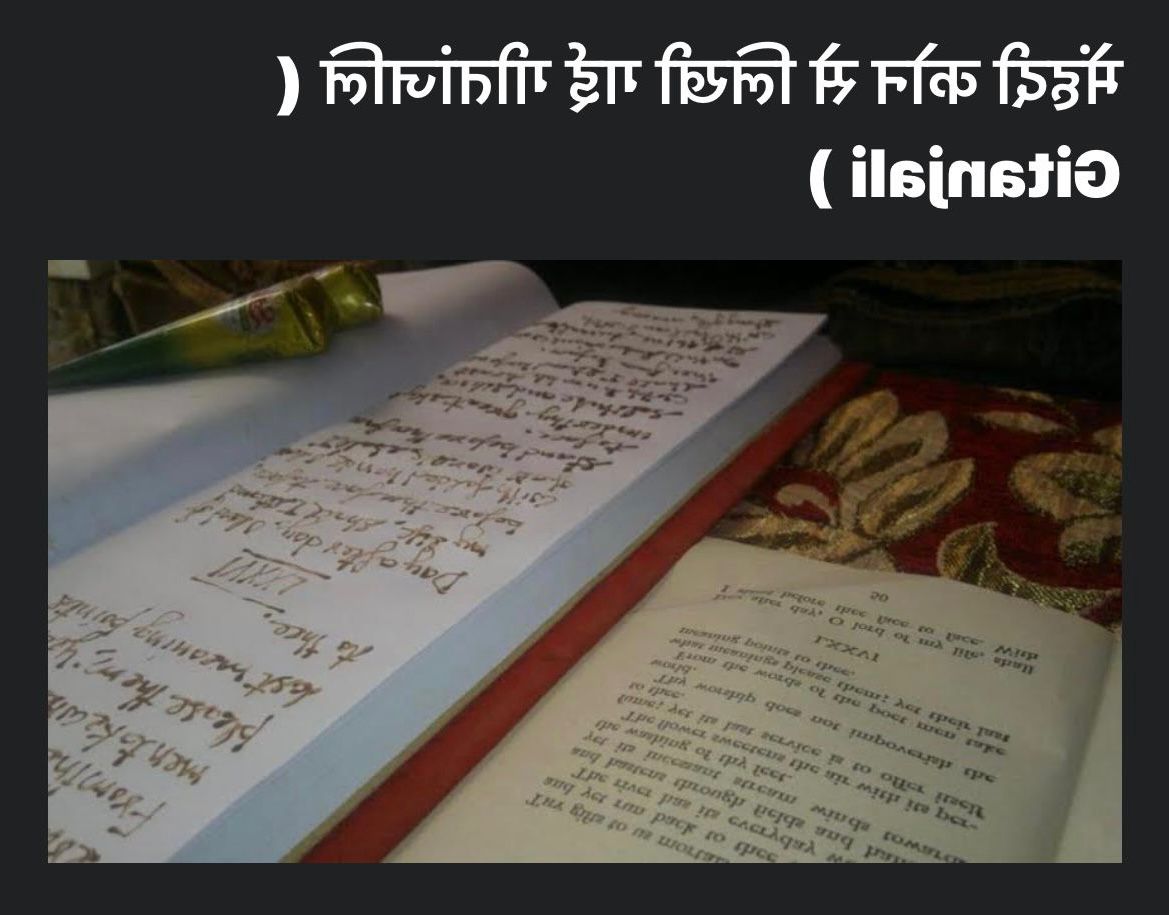 आप इस भाषा को देखेंगे तो एक बार के लिए भौचक्के रह जायेंगे. आपको समझ में नहीं आयेगा कि यह किताब किस भाषा शैली में लिखी हुई है. पर आप जैसे ही दर्पण ( शीशे‌ ) के सामने पहुंचेंगे तो यह किताब खुद-ब-खुद बोलने लगेगी. सारे अक्षर सीधे नजर आयेंगे. इस मिरर इमेज किताब को पीयूष गोयल ने लिखा है. मिलनसार पीयूष गोयल मिरर इमेज की भाषा शैली में कई किताबें लिख चुके हैं.