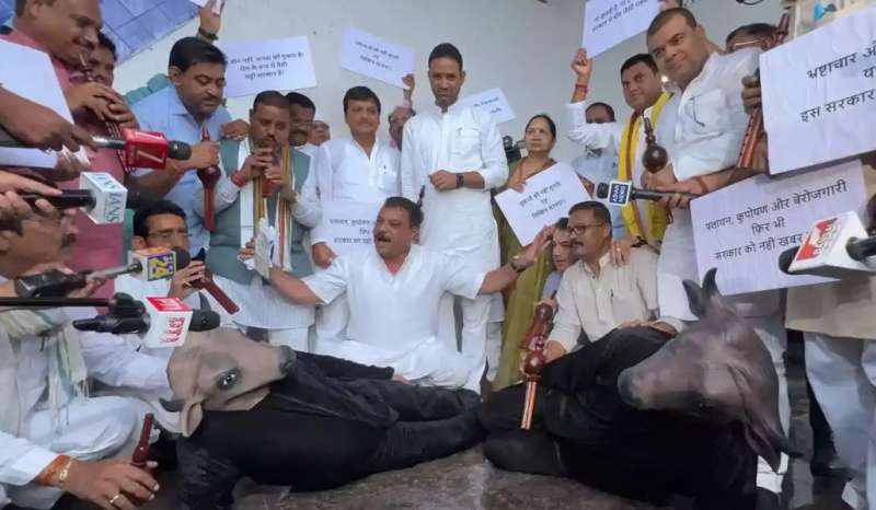 भोपाल : मध्यप्रदेश विधानसभा के मानसून सत्र के दूसरे दिन मंगलवार को विपक्ष ने सरकार सरकार के खिलाफ प्रतिकात्मक प्रदर्शन किया। नेता प्रतिपक्ष उमंग सिंघार के नेतृत्व में कांग्रेस विधायकों ने ‘भैंस के आगे बीन बजाने’ जैसा प्रतीकात्मक विरोध कर भाजपा सरकार पर तीखा हमला बोला। कांग्रेस का कहना हे कि यह विरोध प्रदर्शन सरकार की "संवेदनहीनता" और जनहित के मुद्दों पर "मौन रवैये" के खिलाफ किया गया। प्रदर्शन के दौरान भैंस की प्रतिकृति के साथ कांग्रेस विधायक विधानसभा परिसर पहुंचे और उन्होंने सरकार की नीतियों पर सवाल उठाए। वहीं, सदन में मुख्यमंत्री ने विपक्ष पर तंज कसते हुए कहा कि आज नागपंचमी पर भैंस लेकर आए। कभी गिरगिट लेकर आते हैं। आप चुनेहुए प्रतिनिध हैं। मय्रादा बनाकर रखना चाहिए।