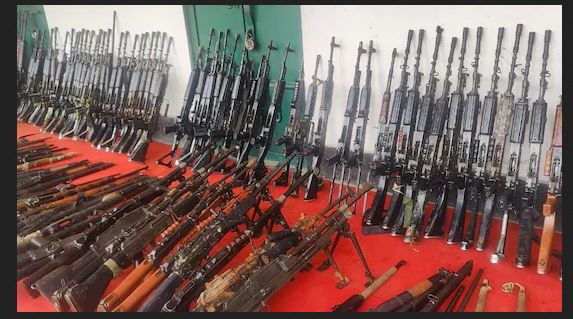 जब्त की गई वस्तुओं में 151 एसएलआर राइफलें, 65 इंसास राइफलें, 73 अन्य राइफलें, पांच कार्बाइन गन, दो एमपी5 गन, 12 लाइट मशीन गन, छह एके सीरीज राइफलें, दो अमोघ राइफलें, एक मोर्टार, छह पिस्तौल, एक एआर-15